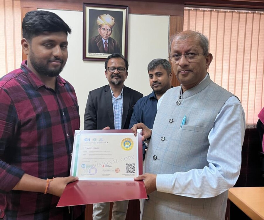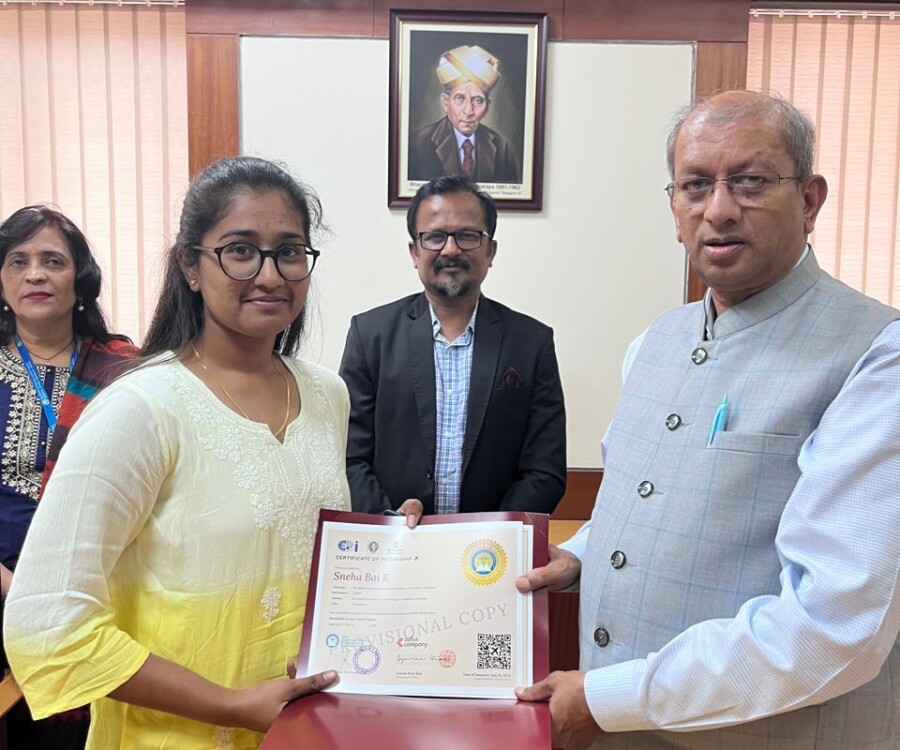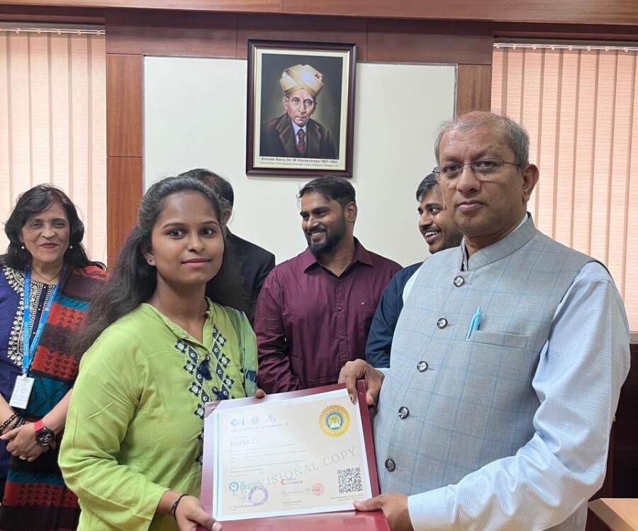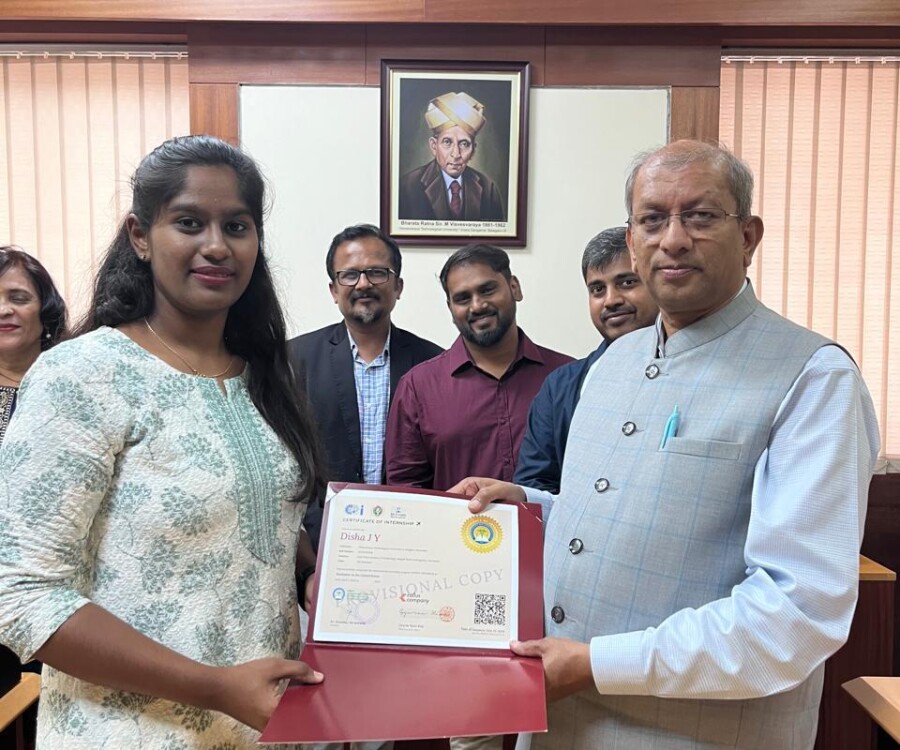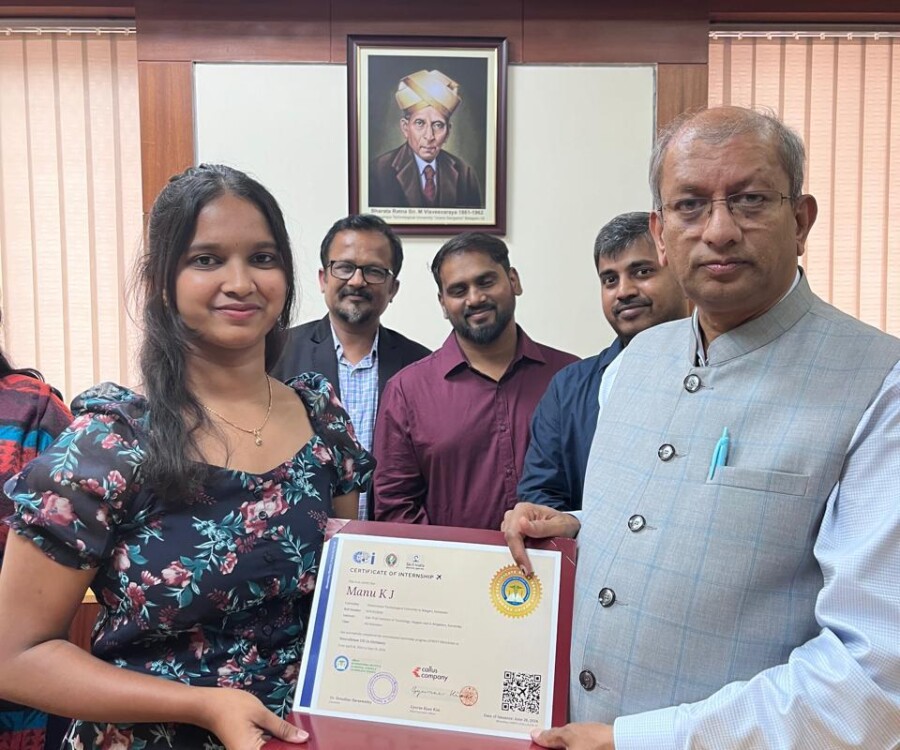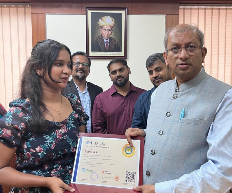 In a historic milestone, the International Institute of Medical Science and Technology Council and Callus company, South Korea, proudly celebrates the certification ceremony of the very first batch of students from the international internship The Edge Program. On this remarkable occasion, the Honorable Vice chancellor Dr.Vidyacshankar is handed over the internship report and foreign certification to the successful students from various institutions under VTU. At this auspicious occasion, Dr.sreedhar Saraswathy, Chairman of AIIMS Technology council, Dr. Sandhya, Director of Skill Development, VTU, Regional directors of VTU and the top officials of AIIMS Technology council such as Prof.Dr.Giri,Prof. Dr. Anil kumar N Joshi, Dr. Deepak Palaksha, Mr.Madhusoodan, and laison officer Mr. Anand, etc, were present.